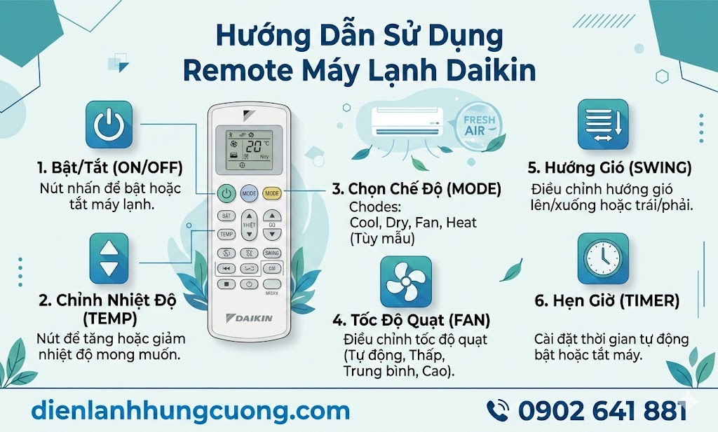 Lời kết: Hy vọng bài viết này đã giúp bạn "giải mã" hoàn toàn chiếc remote máy lạnh Daikin. Nếu máy lạnh nhà bạn đã lâu chưa được bảo dưỡng hoặc đang gặp sự cố, đừng ngần ngại liên hệ với Điện Lạnh Hùng Cường để nhận được sự tư vấn chuyên nghiệp nhất!