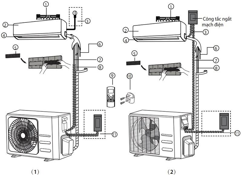 Ống đồng phải đúng kích thước, dây điện đủ tải, ống thoát nước có độ dốc hợp lý để tránh chảy nước ngược vào phòng.
