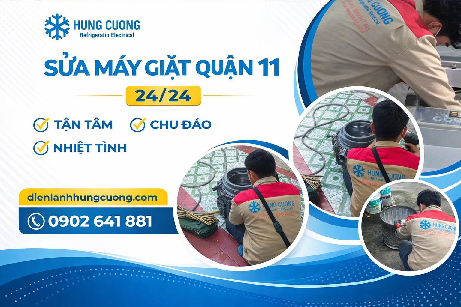 Điện lạnh Hùng Cường chuyên nhận sửa máy giặt quận 11, sửa máy lạnh giá rẻ, bảo trì thay thế, vận chuyển vệ sinh máy lạnh, bơm gas máy lạnh, máy nước nóng và các thiết bị gia dụng khác. Liên hệ ngay theo số hotline 028 6686 4560.