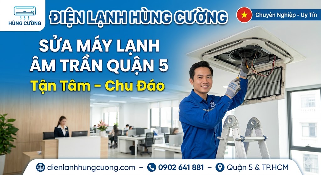 Trong cấu trúc hạ tầng hiện đại tại TP.HCM, máy lạnh âm trần (Cassette) đã trở thành thiết bị không thể thiếu cho các không gian sang trọng như nhà hàng, văn phòng, và biệt thự. Tuy nhiên, việc sửa chữa dòng máy này đòi hỏi kỹ thuật cao hơn rất nhiều so với máy lạnh treo tường thông thường. Nếu bạn đang tìm kiếm một đơn vị sửa máy lạnh Quận 5 uy tín, có mặt ngay sau 30 phút, thì Điện lạnh Hùng Cường chính là điểm đến tin cậy nhất.