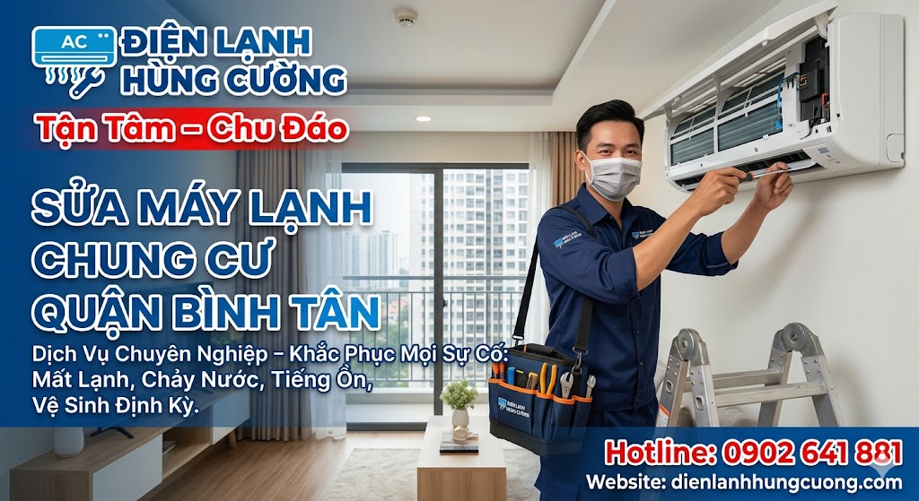 Với dịch vụ sửa máy lạnh chung cư Bình Tân chuyên nghiệp từ Điện lạnh Hùng Cường, chúng tôi cam kết có mặt nhanh chóng, bắt đúng bệnh và xử lý triệt để mọi sự cố. Cho dù bạn cần vệ sinh máy lạnh Bình Tân định kỳ để bảo vệ sức khỏe, hay tìm kiếm một địa chỉ vệ sinh máy lạnh uy tín với mức giá minh bạch, chúng tôi luôn sẵn sàng đồng hành. Hãy cùng khám phá ngay quy trình xử lý chuẩn kỹ thuật và bảng giá chi tiết trong bài viết dưới đây để giữ cho "lá phổi xanh" của căn hộ luôn hoạt động bền bỉ nhất!