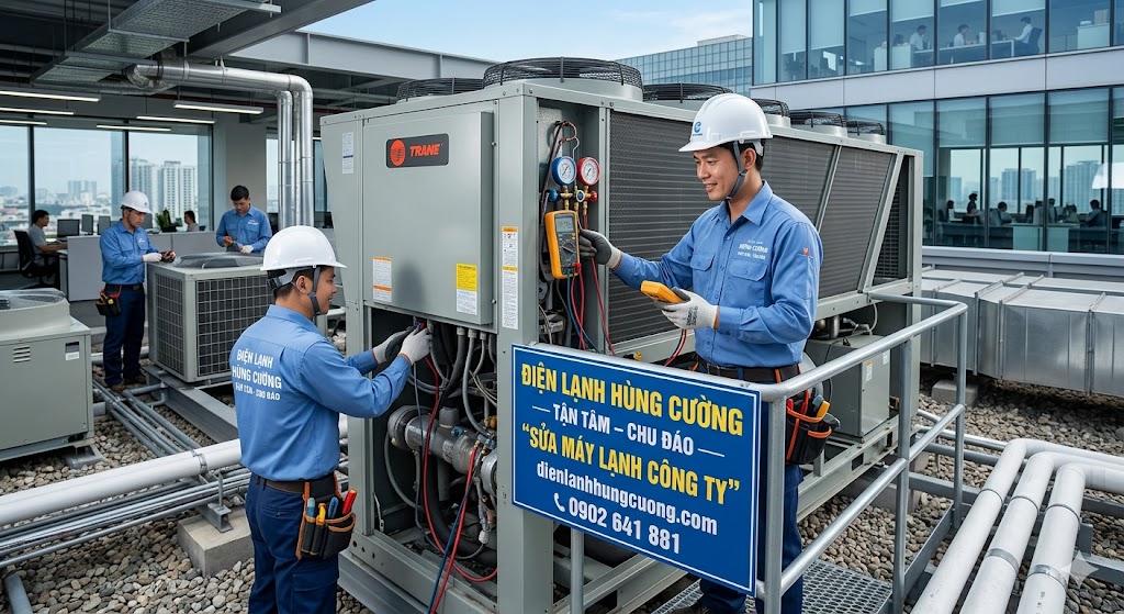 Trong môi trường kinh doanh hiện đại tại TP.HCM, hệ thống máy lạnh không chỉ đơn thuần là thiết bị làm mát mà còn là "lá phổi" duy trì sự sống cho toàn bộ hoạt động của doanh nghiệp. Một sự cố nhỏ từ máy lạnh trung tâm hay máy lạnh âm trần tại văn phòng có thể dẫn đến sự sụt giảm năng suất kinh khủng. Bài viết này sẽ cung cấp cho bạn cái nhìn toàn diện nhất về dịch vụ sửa máy lạnh tại nhà (tận nơi công ty), quy trình bảo trì máy lạnh chuẩn công nghiệp và cập nhật bảng giá sửa máy lạnh mới nhất từ chuyên gia Điện lạnh Hùng Cường.