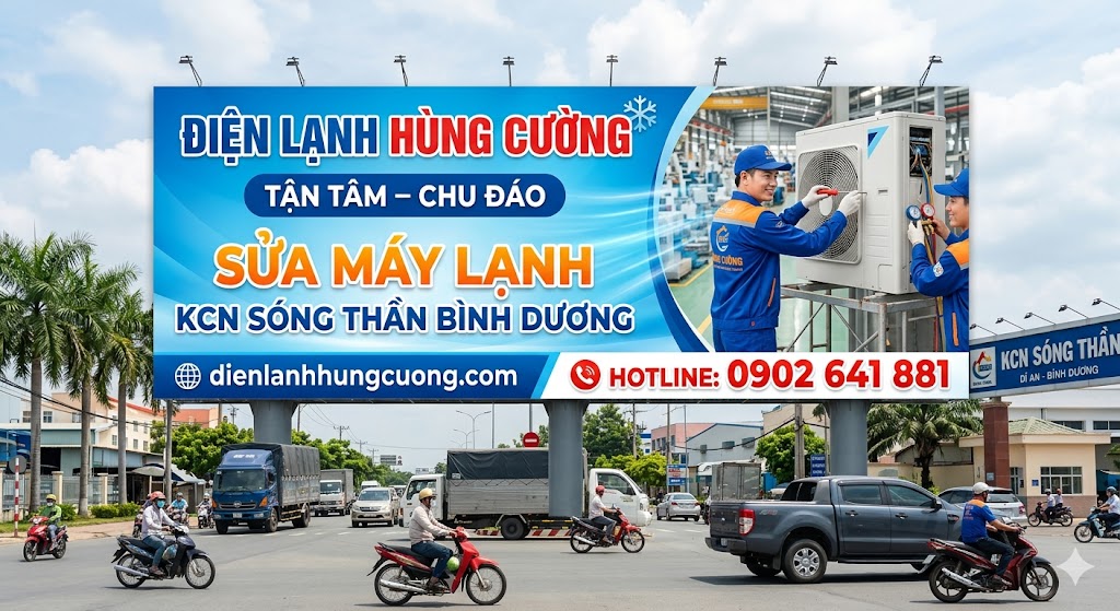 Khu công nghiệp (KCN) Sóng Thần với mật độ nhà xưởng và văn phòng dày đặc là nơi có nhu cầu sử dụng hệ thống làm mát cực cao. Tuy nhiên, môi trường nhiều bụi công nghiệp và việc vận hành liên tục 24/7 thường khiến máy lạnh gặp sự cố bất ngờ. Bạn đang cần một dịch vụ sửa máy lạnh uy tín tại đây? Điện Lạnh Hùng Cường với đội ngũ thợ sửa máy lạnh Bình Dương tay nghề cao cam kết mang lại giải pháp khắc phục nhanh chóng, minh bạch và tiết kiệm nhất.