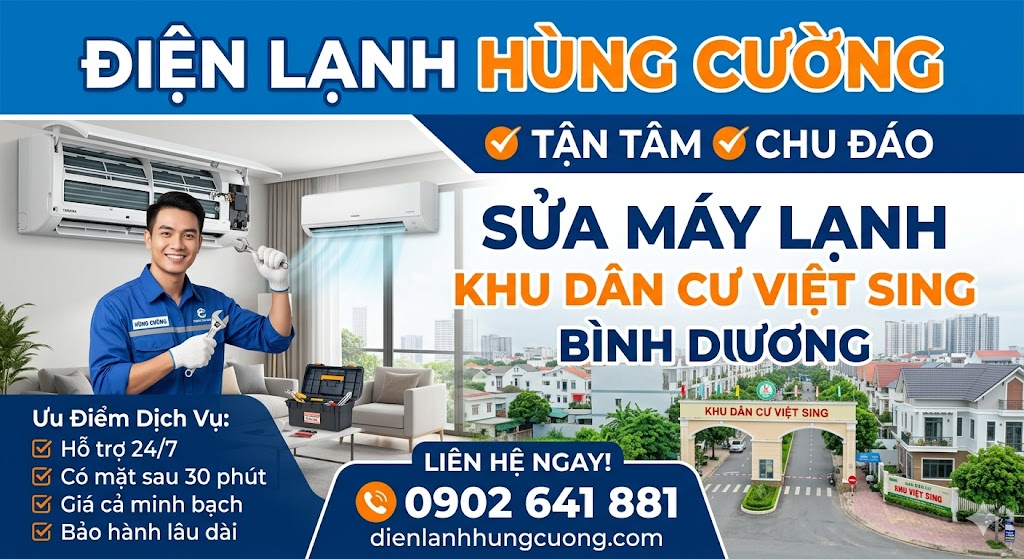 Khu dân cư (KDC) Việt Sing, tọa lạc tại ranh giới giữa Thuận Giao và An Phú (Thuận An, Bình Dương), là một trong những khu vực có mật độ dân cư và văn phòng cao nhất tỉnh. Với đặc thù khí hậu nhiệt đới gió mùa, nắng nóng kéo dài, chiếc máy lạnh tại đây phải hoạt động gần như tối đa công suất. Tuy nhiên, không phải ai cũng biết cách bảo trì và lựa chọn đơn vị sửa máy lạnh Bình Dương uy tín. Bài viết này sẽ cung cấp cho cư dân Việt Sing cái nhìn toàn diện nhất về dịch vụ điện lạnh hiện nay.