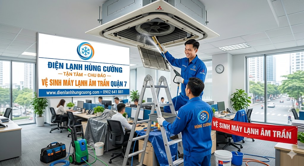 Việc sở hữu một hệ thống máy lạnh âm trần (Cassette) sang trọng trong văn phòng hay căn hộ cao cấp tại Quận 7 là điều tuyệt vời. Tuy nhiên, sau một thời gian vận hành, bụi bẩn và vi khuẩn sẽ âm thầm tấn công thiết bị của bạn. Dịch vụ vệ sinh máy lạnh âm trần Quận 7 của Điện Lạnh Hùng Cường sẽ giúp bạn giải quyết triệt để vấn đề này.